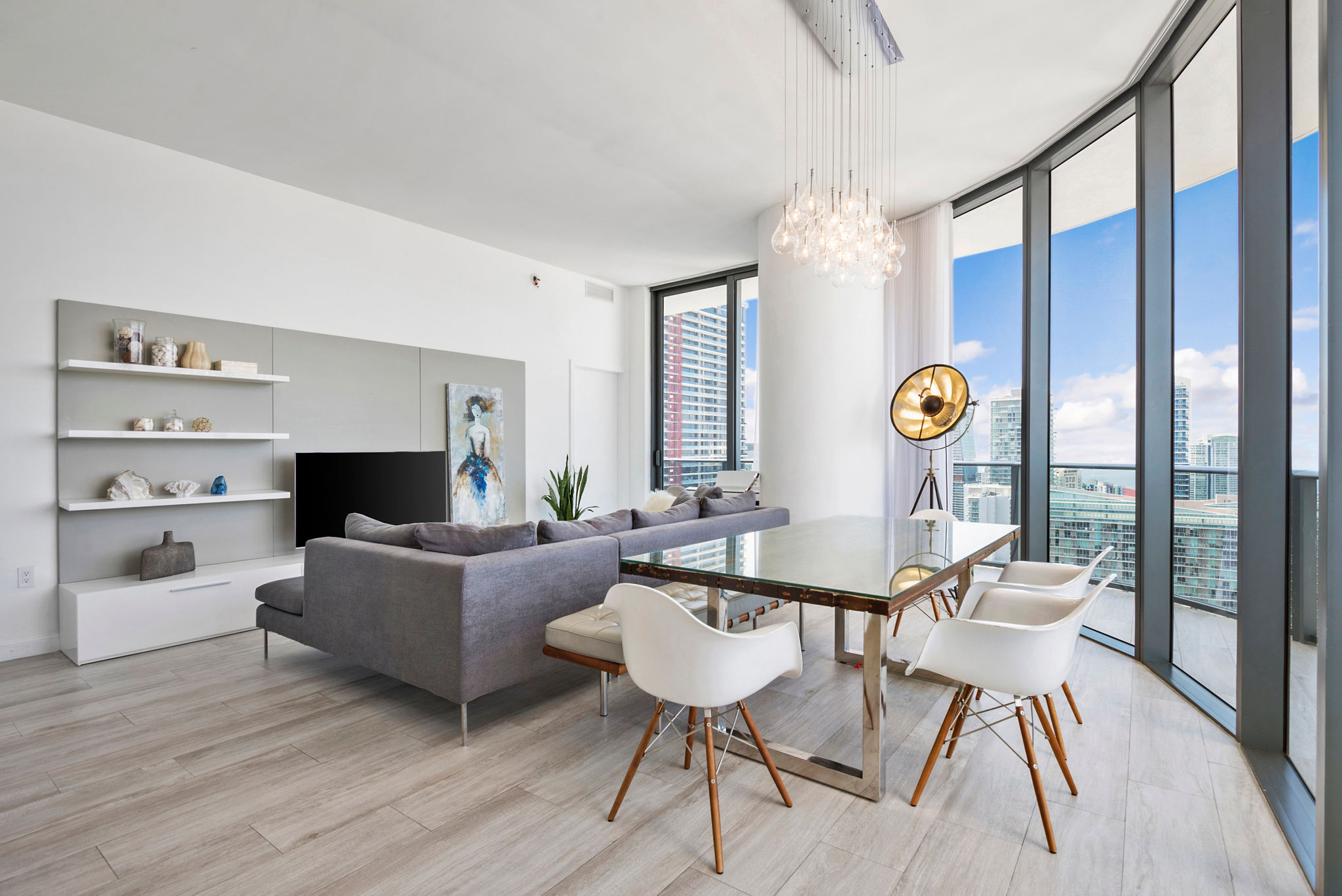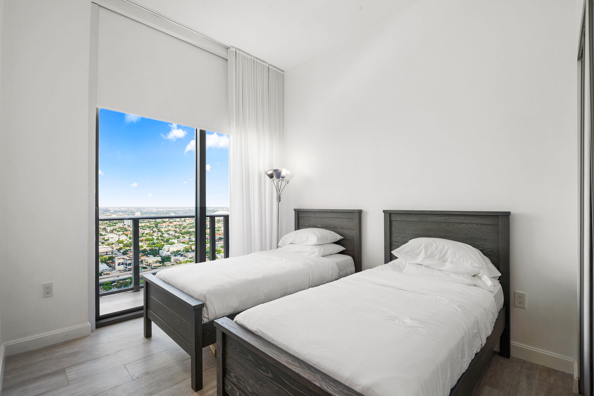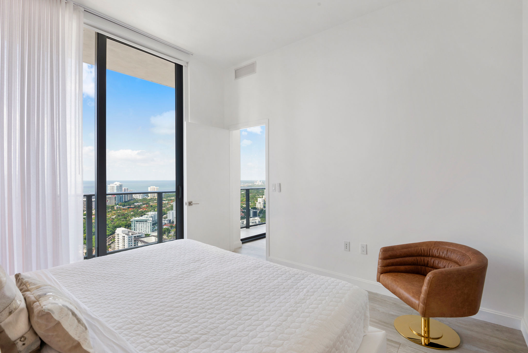 The 11-ft. ceilings allow Miami’s natural light to gently enter your home in the sky, making it feel bright and spacious. Soak in the sun from the rooftop pool and the sunset from your private wraparound glass balcony, both with unobstructed views.